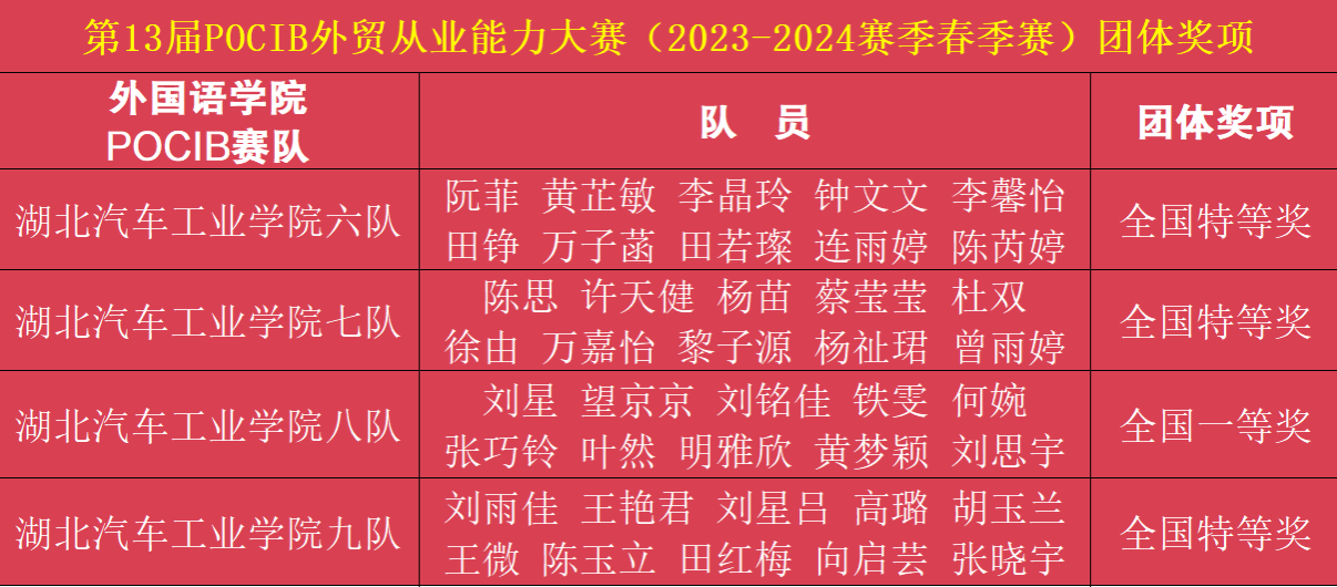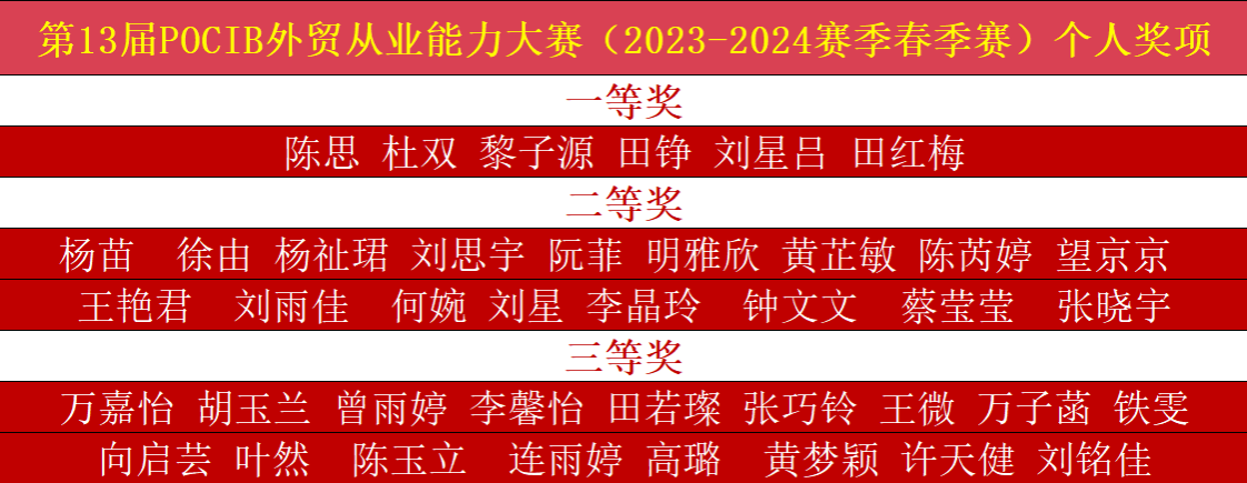 4月19日上午,第十三届POCIB全国外贸从业能力大赛(2023-2024赛季春季赛)圆满结束。外国语学院英语专业2021级共40名学生组成的四支队伍参赛,共获得3项团体特等奖,1项团体一等奖;40名参赛学生全部获得个人奖项,其中一等奖6名,二等奖17名,三等奖17名。