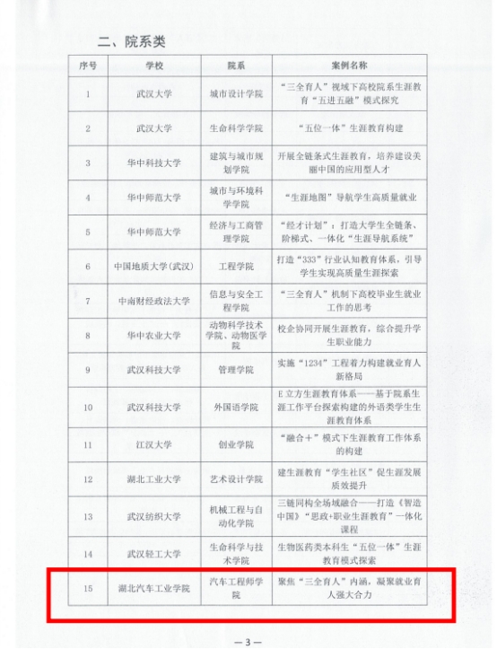 近日,湖北省高等学校毕业生就业指导服务中心公布了2023年高校生涯教育典型案例名单。汽车工程师学院学工办主任杨耀钧撰写的《聚焦“三全育人”内涵,凝聚就业育人强大合力》成功获批院系典型案例。